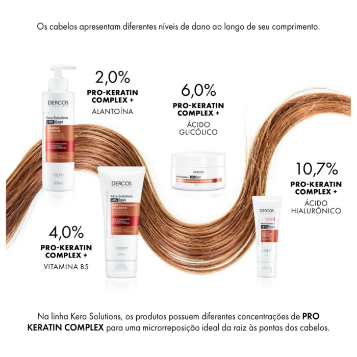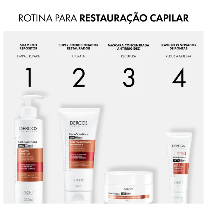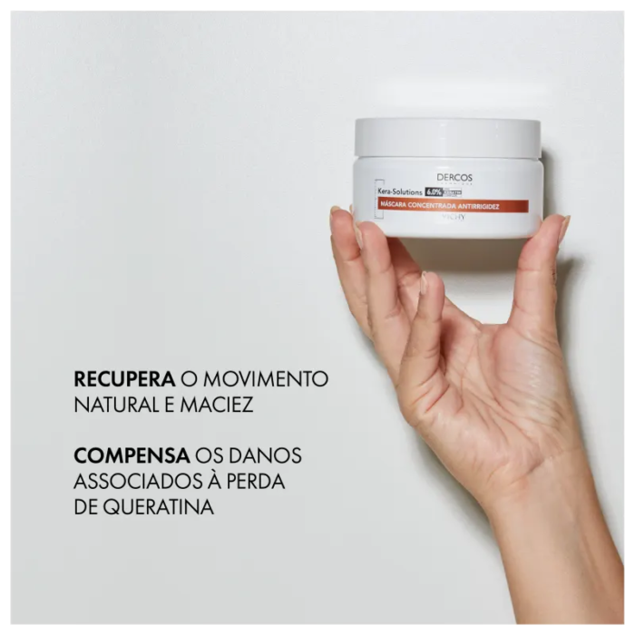 A Máscara Capilar Vichy Dercos Kera-Solutions age de forma precisa, recuperando as áreas mais porosas e danificadas do cabelo, graças à sua Tecnologia de Microrrestauração Instantânea, que penetra nas cutículas renovando os fios, de dentro para fora. Assim, o cabelo fica mais saudável e resistente à química e agressões externas.