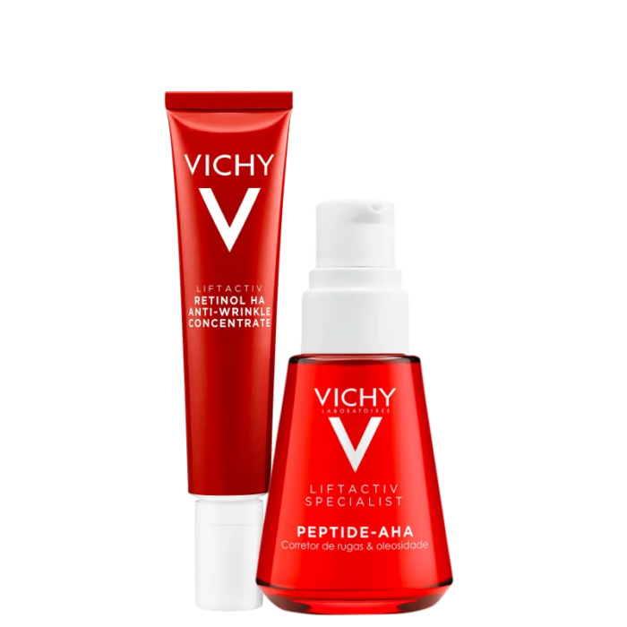 O Kit Vichy Liftactiv Duplo Tratamento une fórmulas que ajudam na correção de marcas difíceis, como o “bigode chinês”, além de controlar o brilho excessivo do rosto. Garante realmente um tratamento de outro nível para a tez das clientes.